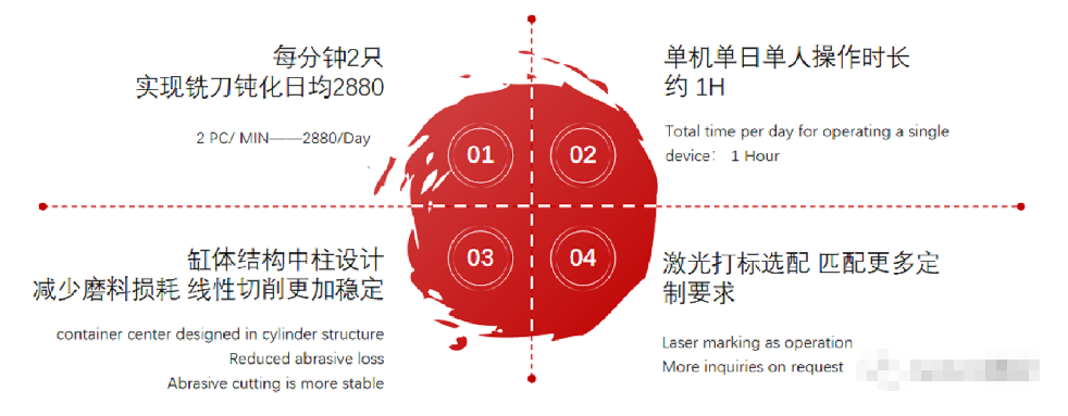 实现高效,稳定的刀具刃口制备,助力智能化工业生产。可实现自动激光打标,钝化一体化完结关于效率:基于普通刃口制备设备 15分...